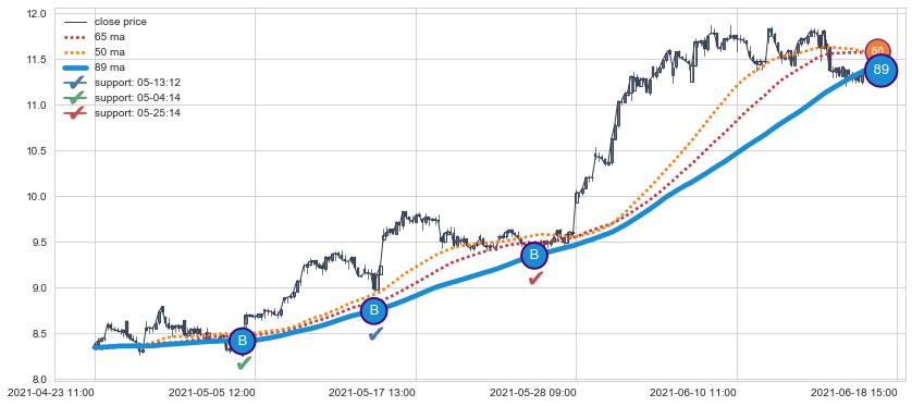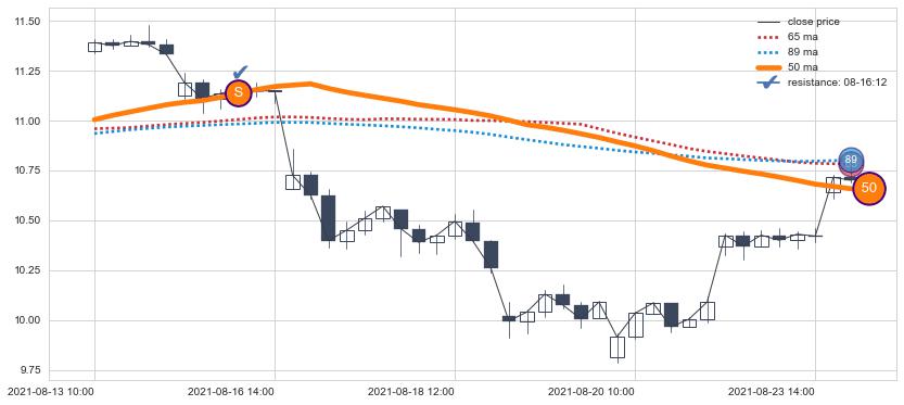➢ 最优均线组合共正确确认支撑阻力信号12处,正确确认率 75.00%