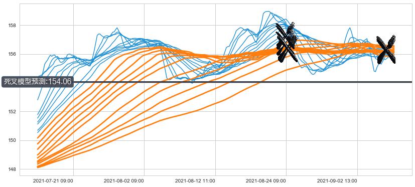 ➣ 110小时均线于(08-24 09:00: 156.34)形成【死叉】基于【死叉历史模型】预测死叉后最低波谷价格: 153.14, 死叉后最低价格154.36,尚未达到预测最低波谷价格, 预期继续下跌