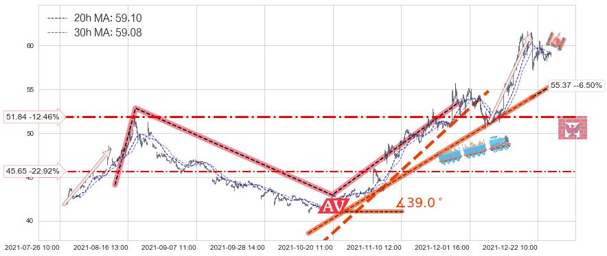 ♘ 支撑价格位51.84,可信任强度66.15%,距离最后交易2021-12-27 15:00形成的收盘价格59.22相差 -12.46%