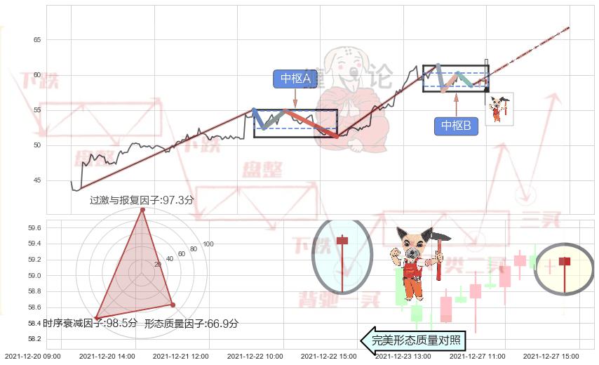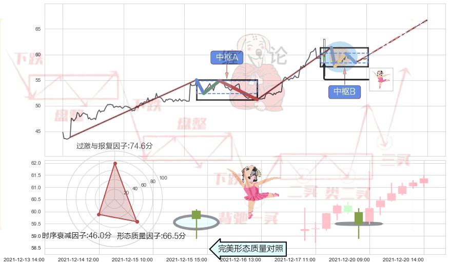 ➣ 【中枢B】:12-20:14-12-23:13,中枢由4笔构成,共21交易小时, ZG=60.23, ZD=58.41
