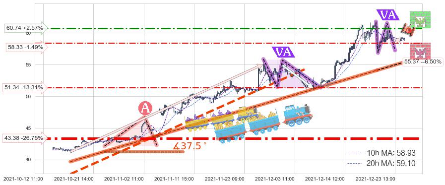 ♘ 阻力价格位60.74,可信任强度59.80%,距离最后交易2021-12-27 15:00形成的收盘价格59.22相差 +2.57%