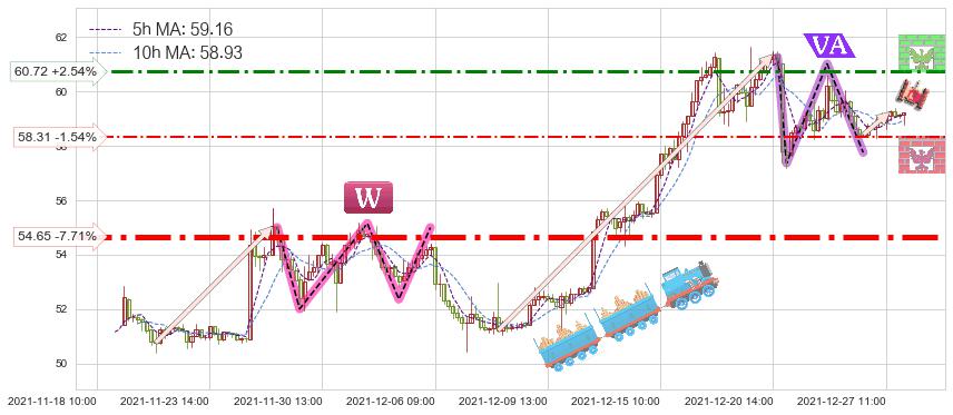 ♘ 阻力价格位60.72,可信任强度66.79%,距离最后交易2021-12-27 15:00形成的收盘价格59.22相差 +2.54%