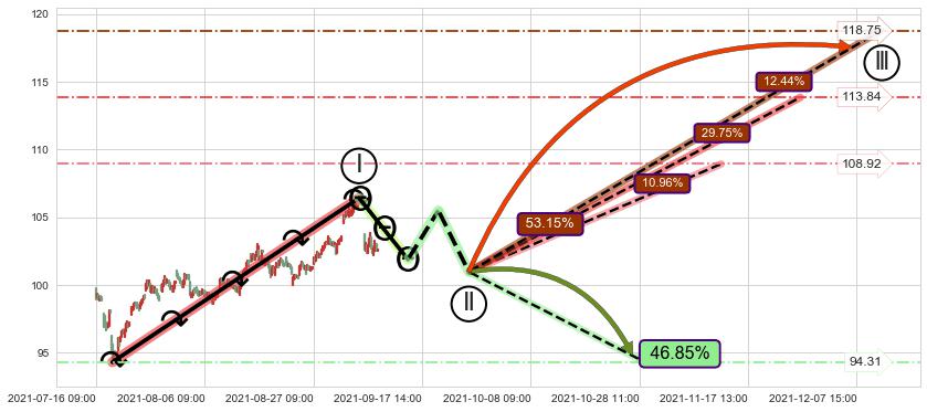 ➢ 循环浪继续向上【最高】位置(12-13:09, 118.75),匹配聚类样本比例23.40%, 可能性概率12.44%