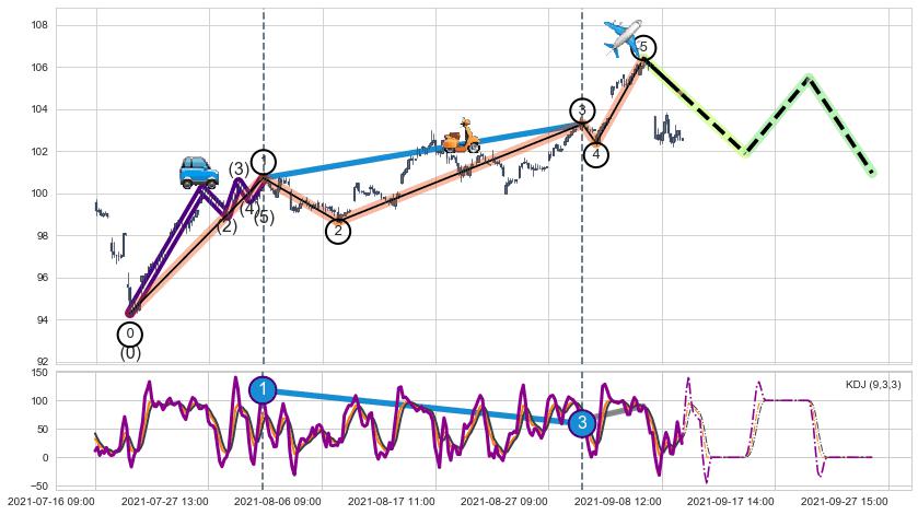 ➣ 第一, 三驱动浪端点:【KDJ】走势出现【常规背离 & 反转信号】背离程度99.00%,背离夹角角度47.7˚,背离程度较大