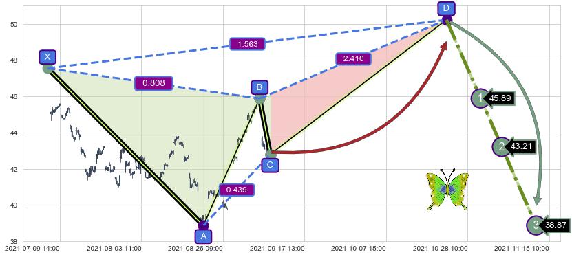 ➢ 谐波蝴蝶:b下跌接近c:猜想支撑性拉升 → 上涨 →【拐点】支撑临近 → 大趋势均值回复