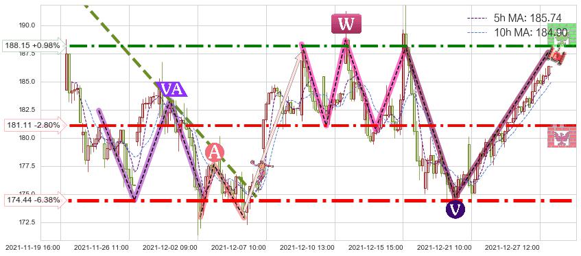 ♘ 支撑价格位181.11,可信任强度83.08%,距离最后交易2021-12-27 16:00形成的收盘价格186.33相差 -2.80%