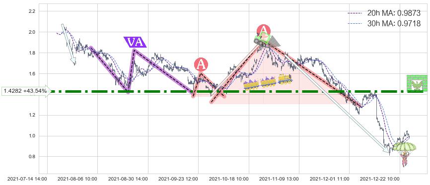 从2021-11-03 10:00至2021-12-27 15:00,共包含248个小时,阶段股价下跌-53.36%,阶段股价变动位移路程比: 1 : 5