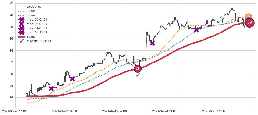 ➣ 89小时均线于(07-22 14:00: 86.81)形成【金叉】基于【金叉历史模型】预测金叉后最高波峰价格: 90.61, 金叉后最高价格104.47,已经上涨超出预测最高波峰价格, 预期回调