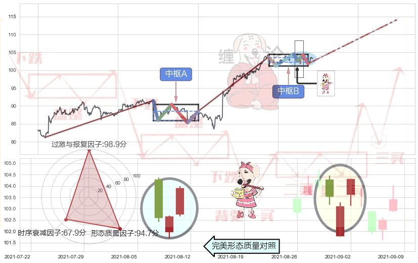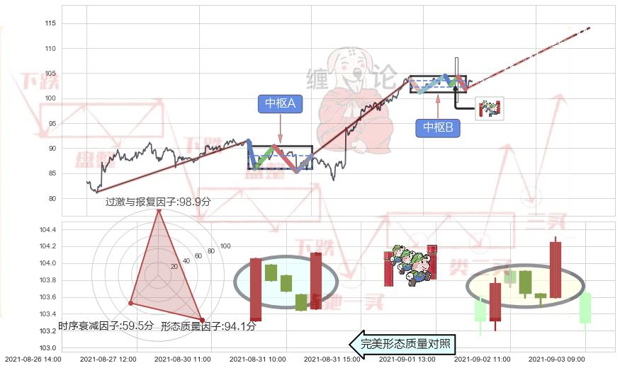 ➣ 【中枢B】:08-16:14-09-08:09,中枢由6笔构成,共99交易小时, ZG=103.72, ZD=102.54