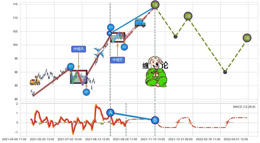 ➣ 缠论中枢点:上升缠中枢B突破后距离1卖距离较远,随后猜想后续持续拉升(趋势跟踪)