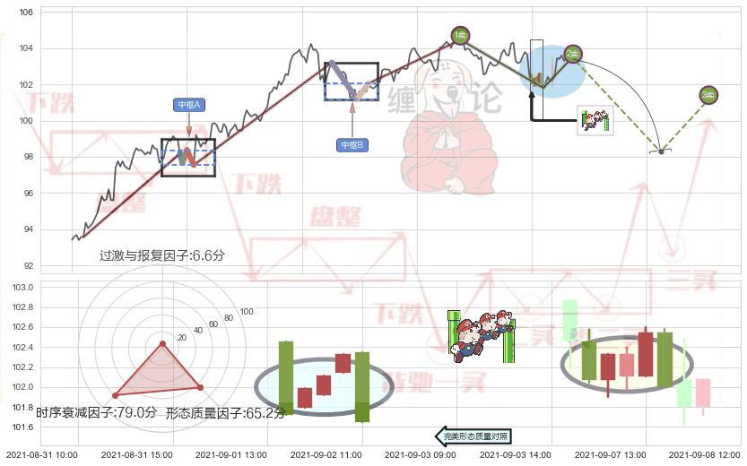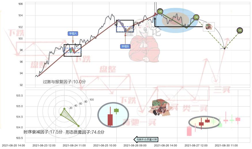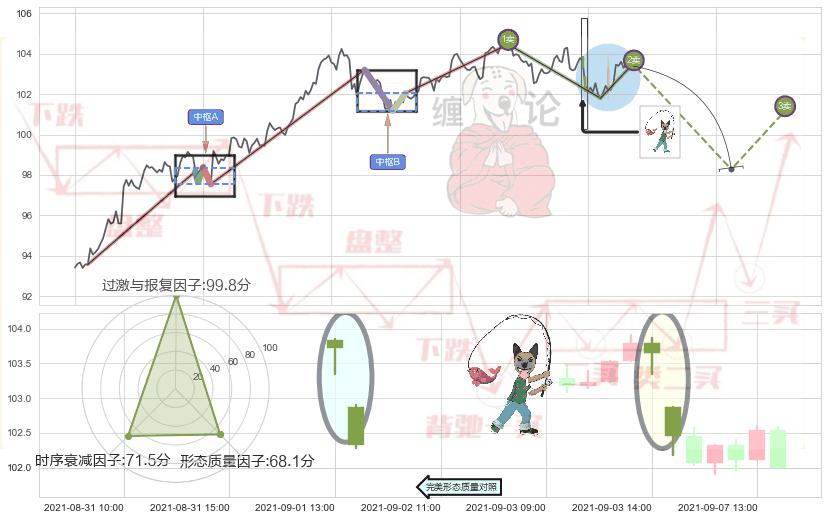 ➣ 【中枢B】:08-17:14-08-20:10,中枢由3笔构成,共17交易小时, ZG=102.05, ZD=101.18