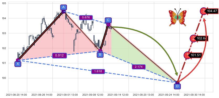 ➢ 距离预测D点位置有足够的下跌空间, 与看涨【蝴蝶】形态相反,实际方向【看跌】