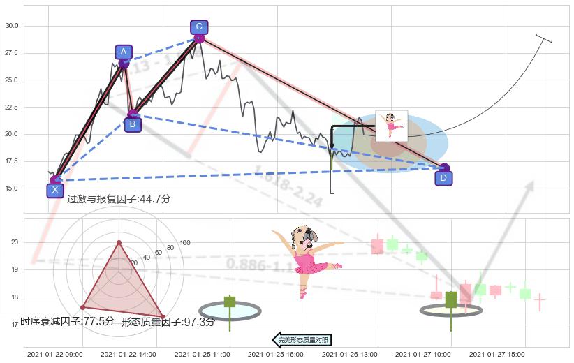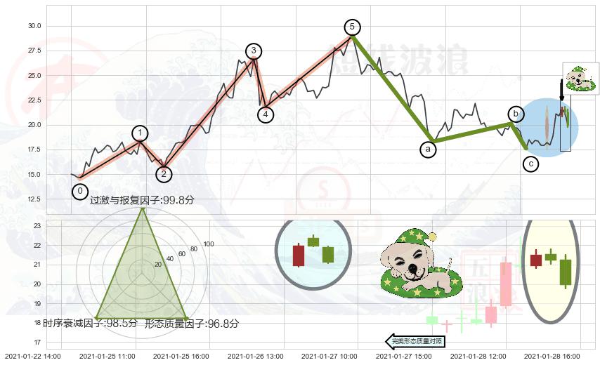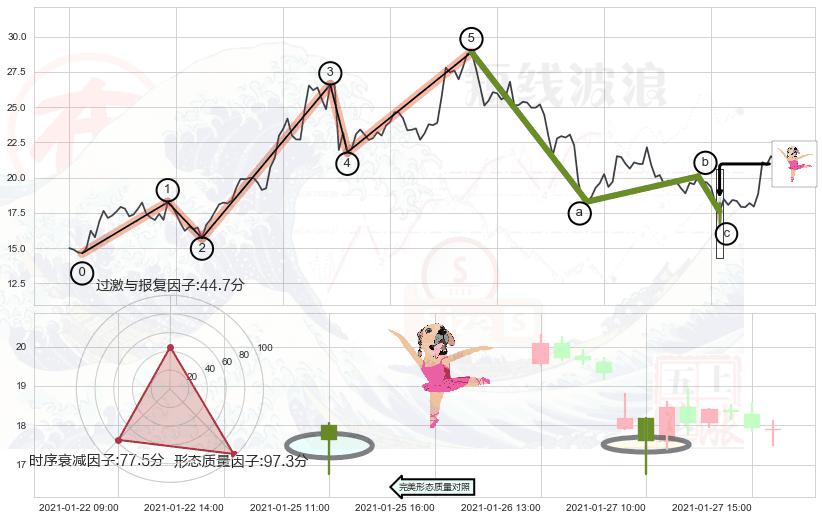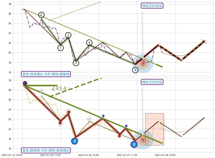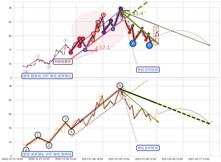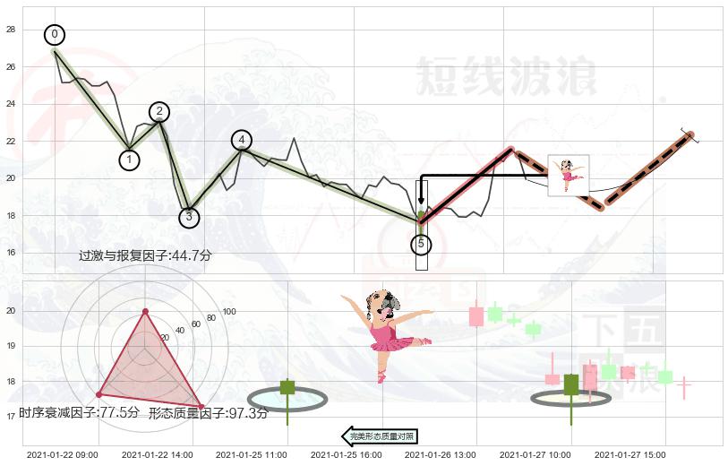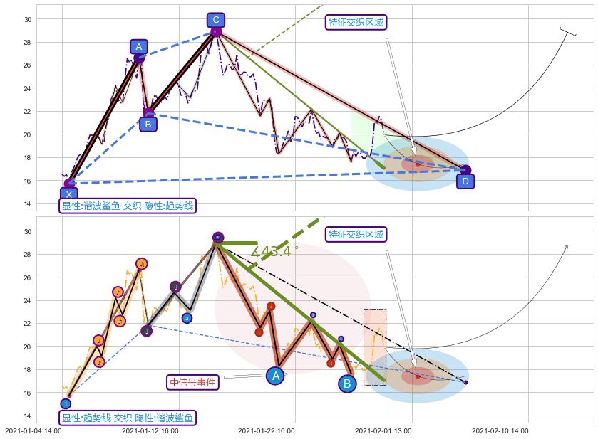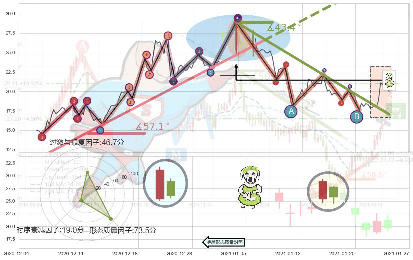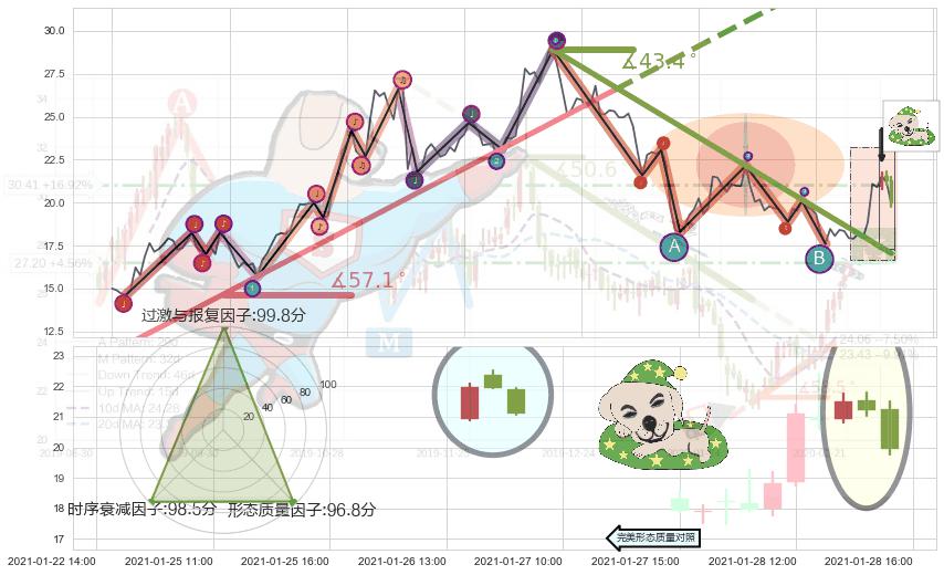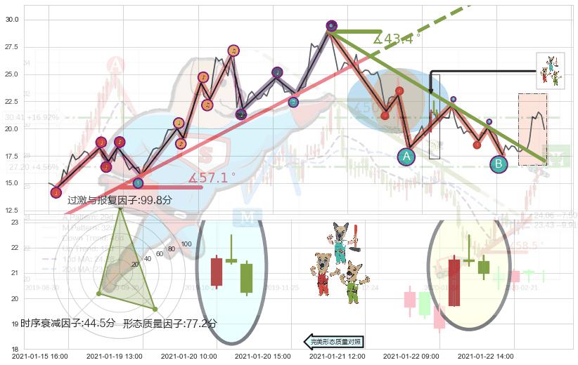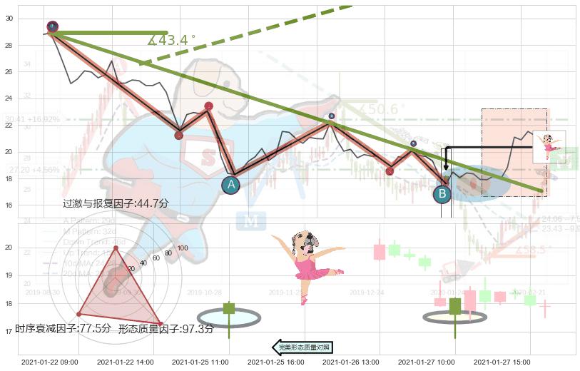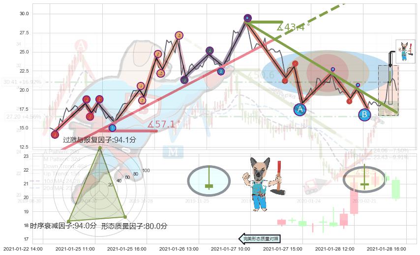 从2021-01-14 16:00至2021-01-28 13:00,共包含70个小时,阶段股价下跌-27.53%,阶段股价变动位移路程比: 1 : 6,下跌趋势角度: 43.4