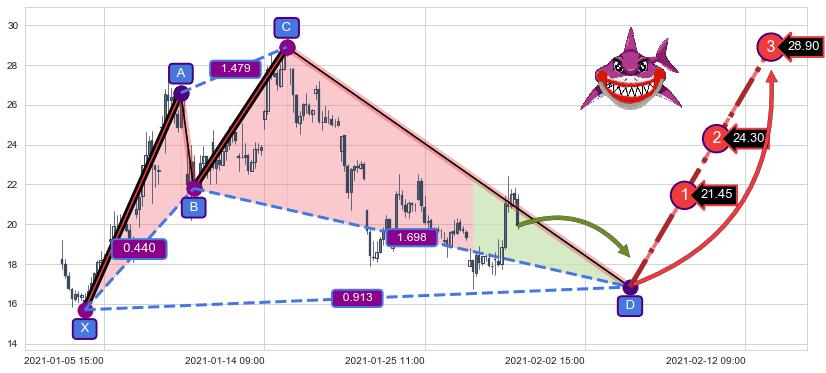 ➣ 谐波鲨鱼:c下跌临近d:猜想拉升 → 上涨 →【拐点】强支撑临近 → 大趋势均值回复