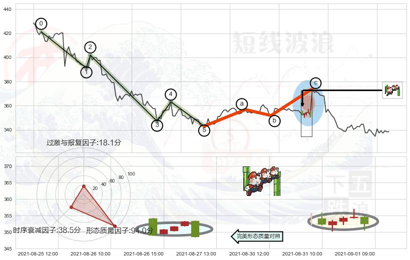 ➣ 下降三部曲(降势三鹤) + 波浪理论c点反弹终止反转下跌信号叠加后【反向回撤率】偏高,【看空】信号叠加【存续影响降权】
