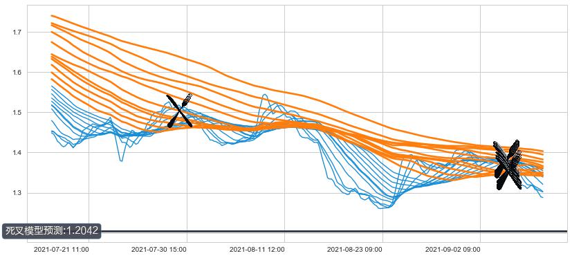 ➢ 21小时均线于(07-30 11:00: 1.5016)形成【死叉】基于【死叉历史模型】预测死叉后最低波谷价格: 1.3141, 死叉后最低价格1.2500,已经下跌超出预测最低波谷价格, 预期反弹