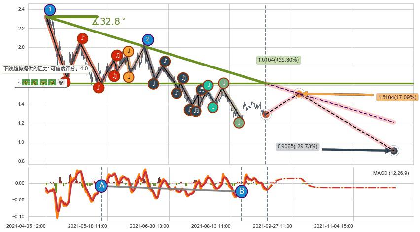 从2021-04-05 14:00至2021-08-23 14:00,共包含641个小时,阶段股价下跌-49.86%,阶段股价变动位移路程比: 1 : 14,下跌趋势角度: 32.8