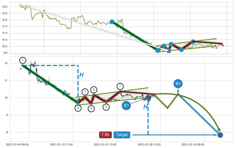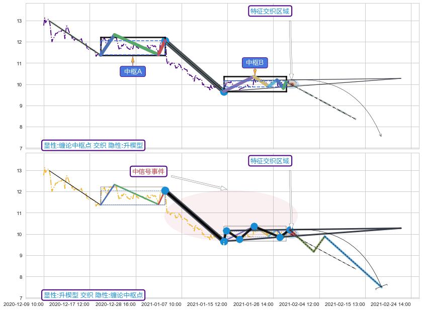 ➣ 缠论中枢点:猜想破位中枢B后持续下拉 → 下跌 → 破位中枢B支撑 → 持续趋势跟踪