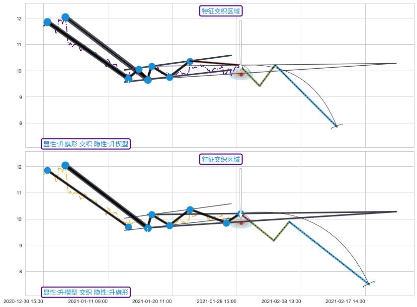➢ 看跌(高位倒锤头)流星线 + 升旗形临近支撑猜想转换阻力下跌信号叠加后【反向回撤率】低,【看空】信号叠加【存续影响大】