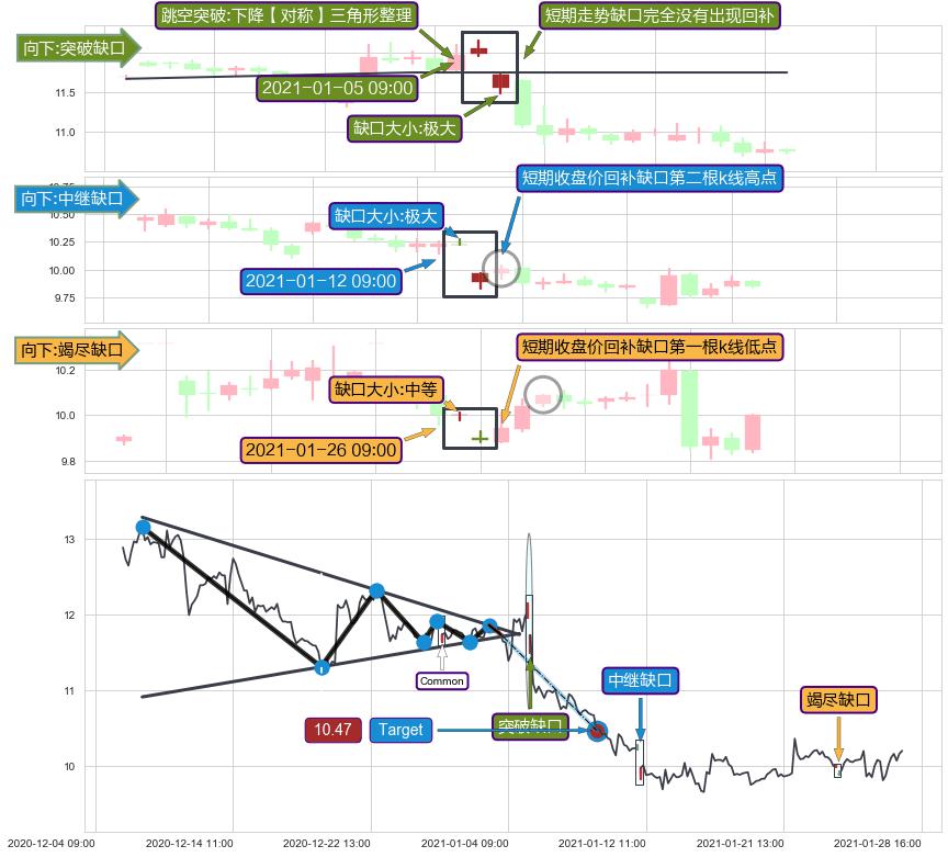 ➣ 普通缺口在【下降【对称】三角形整理】震荡整理形态中出现