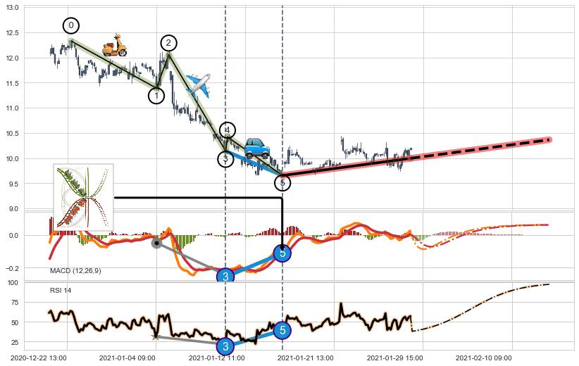 ➣ 低档五阳线 + 波浪理论下跌浪:浪5反弹拐点信号叠加后【反向回撤率】极低,【看多】信号叠加【存续影响极大】