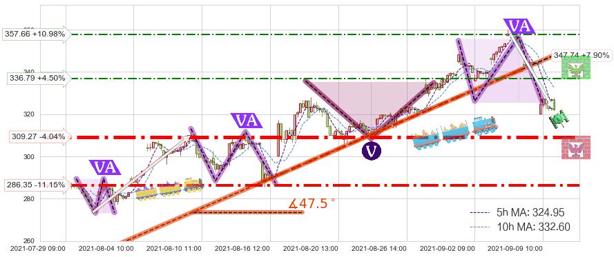 ➣ 2021-07-30 13:00-2021-09-07 14:00上升趋势存在反转[风险],其原上升趋势的支撑位(347.74)已破位[强阻力信号],原上升趋势角度: 47.5˚