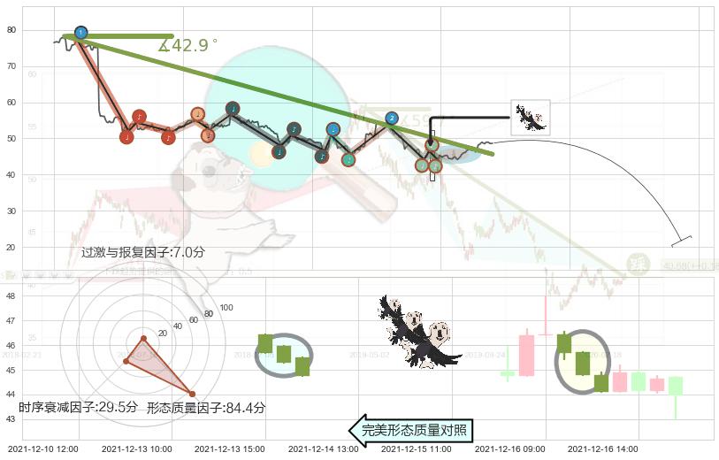从2021-10-15 13:00至2021-12-22 09:00,共包含313个小时,阶段股价下跌-45.39%,阶段股价变动位移路程比: 1 : 6,下跌趋势角度: 42.9,2021-10-22 09:00向↘︎形成缺口,跳空下跌-23.18%˚