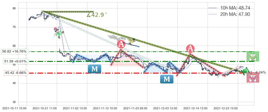♘ 在最后的下跌阶段2021-10-15 13:00至2021-12-22 09:00,存在 破位边缘的阻力位 ,阻力价格45.62,可信任强度76.94%,其距离最后价格48.66相差 -6.24%