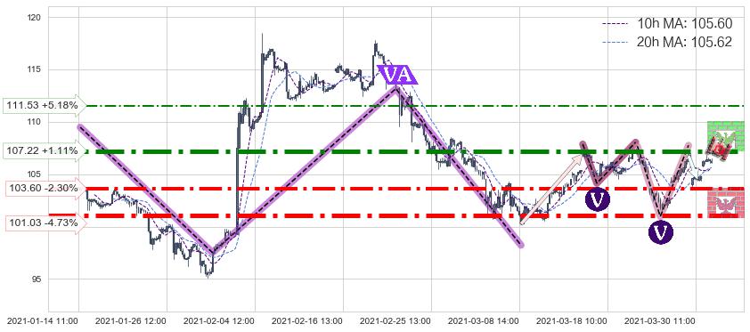 ♘ 阻力价格位107.22,可信任强度89.44%,距离最后交易2021-03-31 14:00形成的收盘价格106.04相差 +1.11%