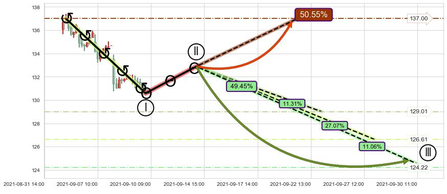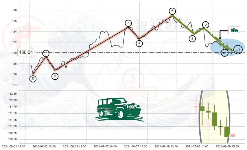 ➣ c.1: 当前c浪回调位置(09-09:14, 130.59),仍然有回调空间