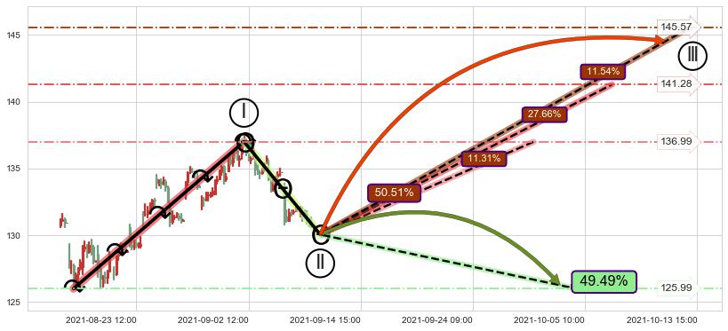 ➣ 循环浪继续向上【平均值】位置(10-06:15, 141.28),匹配聚类样本比例54.75%, 可能性概率27.66%