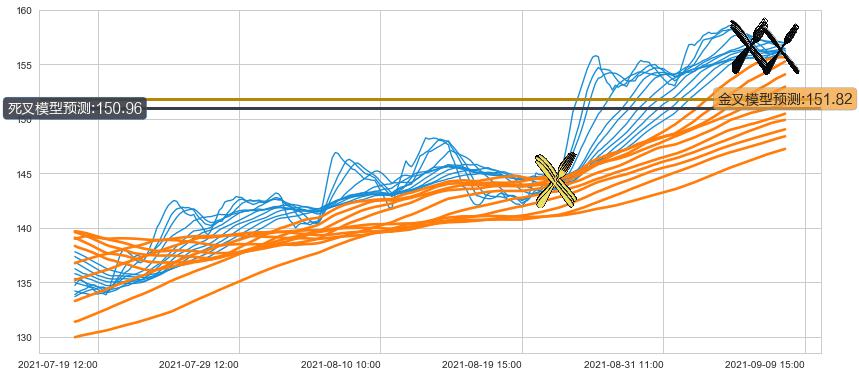 ➣ 34小时均线于(09-07 14:00: 156.51)形成【死叉】基于【死叉历史模型】预测死叉后最低波谷价格: 151.54, 死叉后最低价格154.60,尚未达到预测最低波谷价格, 预期继续下跌