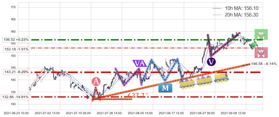 ♞ 10小时均线:156.10,20小时均线:156.30→ 快线<慢线