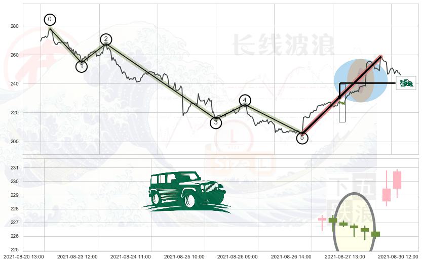 从2021-06-30 12:00至2021-08-23 09:00,共包含224个小时,阶段股价下跌-22.35%,阶段股价变动位移路程比: 1 : 6,下跌趋势角度: 55.4,2021-07-28 09:00向↘︎形成缺口,跳空下跌-8.03%˚