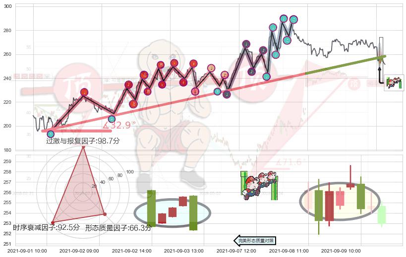 从2021-09-01 09:00至2021-09-09 14:00,共包含36个小时,阶段股价下跌-7.74%,阶段股价变动位移路程比: 1 : 2