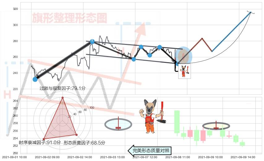 ➣ 【未确认突破,预测即将形成突破】降⚑旗形起点:07-08:09, 预测突破点:09-15:12,形态共302交易小时