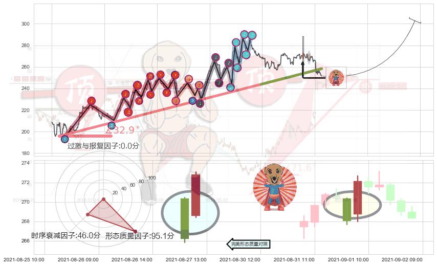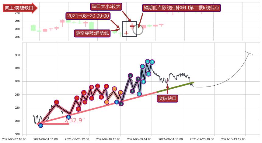 从2021-05-14 13:00至2021-08-12 14:00,共包含385个小时,阶段股价上涨27.91%,阶段股价变动位移路程比: 1 : 9,上涨趋势角度: 32.9,2021-08-02 09:00向⇪形成缺口,跳空上涨+10.53%