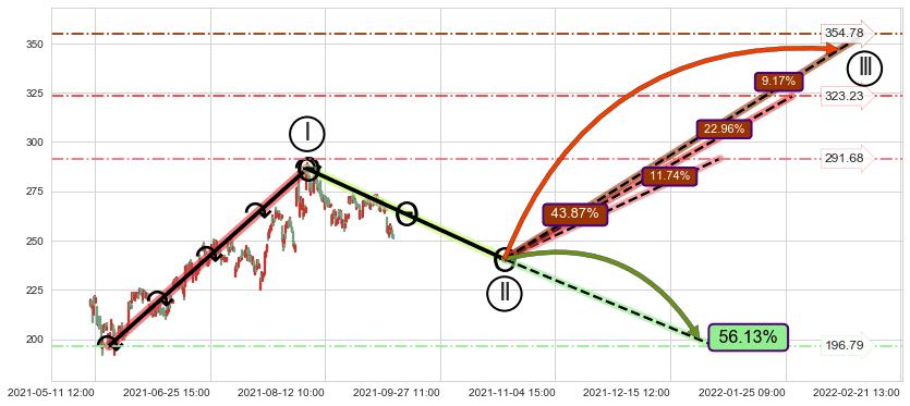 ♘ 在最后的上升阶段2021-05-14 13:00至2021-08-12 14:00存在 破位边缘的支撑位 ,支撑价格258.31,支撑可信任强度76.82%,其距离最后价格251.54相差 +2.69%