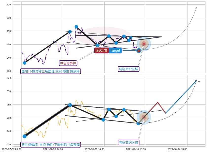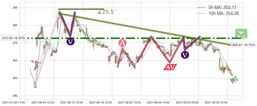 2021-08-06: 时域附近第一阻力位272.59持续的对下跌趋势进行阻拦,有效地放缓了下跌的速度。