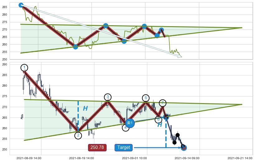 ➣ 【多空双方观望→争持→促使价格波动日益狭窄→空方打破攻守平衡点】对称三角形中继整理, 已在09-07:10突破【支撑】颈线 265.25 →演变成下降通道