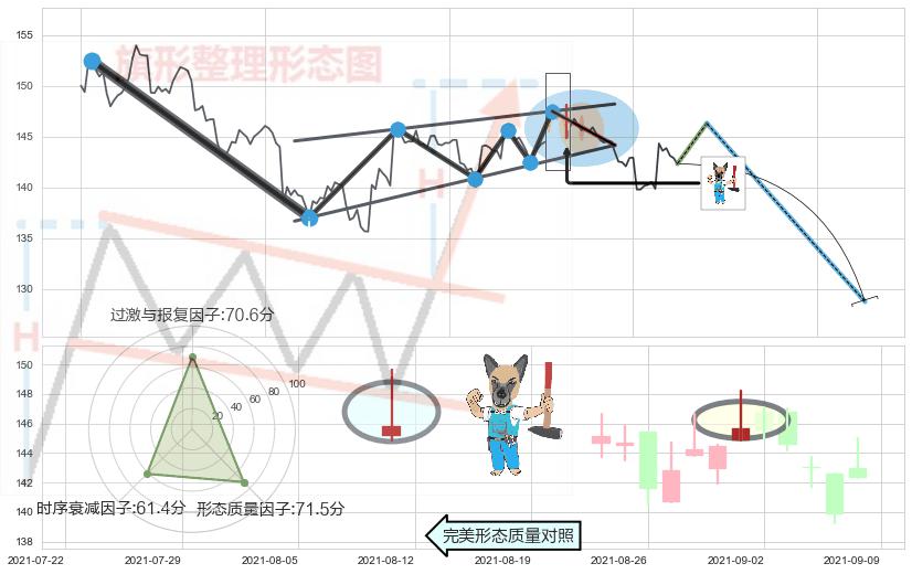 从2021-08-05 11:00至2021-08-17 14:00,共包含52个小时,阶段股价下跌-10.10%,阶段股价变动位移路程比: 1 : 2,下跌趋势角度: 62.9