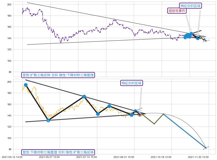 ➢ 扩散三角反转属【短级别信号事件】下降对称三角整理属【长级别信号事件】长短周期组合信号事件, 短长事件长度比7.34%