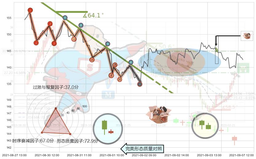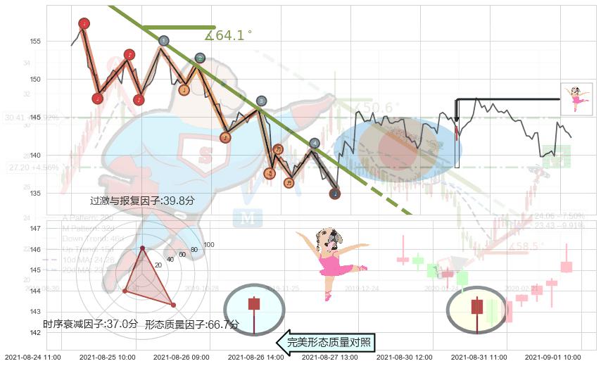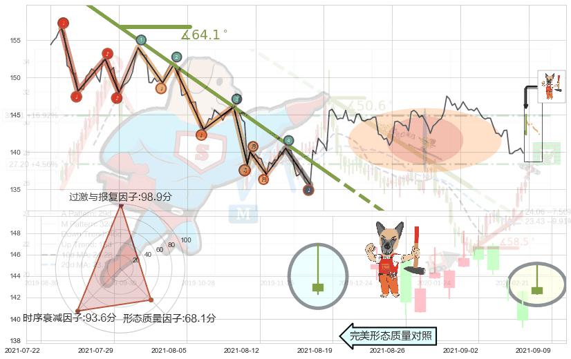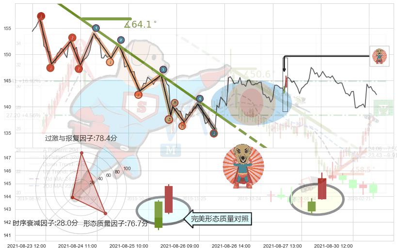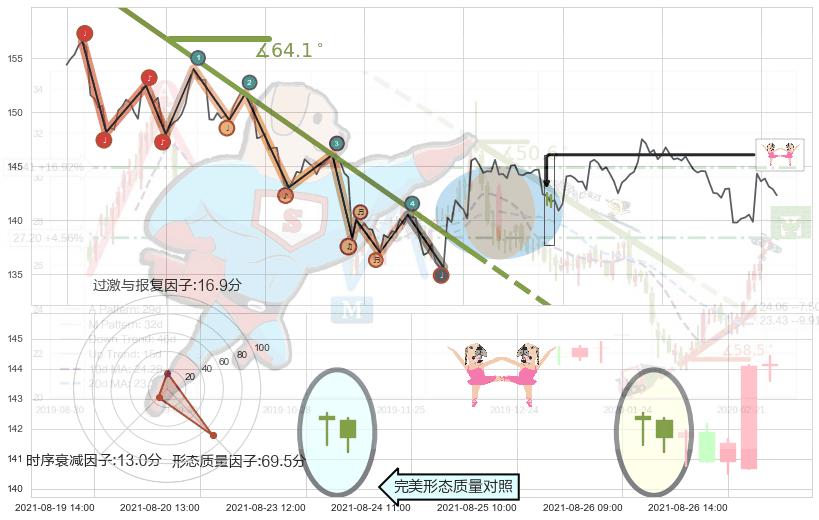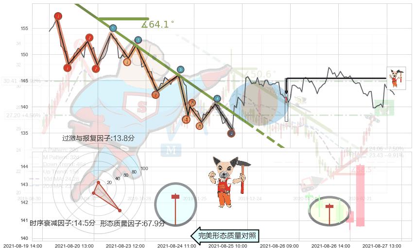 从2021-07-29 13:00至2021-08-23 09:00,共包含99个小时,阶段股价下跌-6.81%,阶段股价变动位移路程比: 1 : 9,下跌趋势角度: 64.1