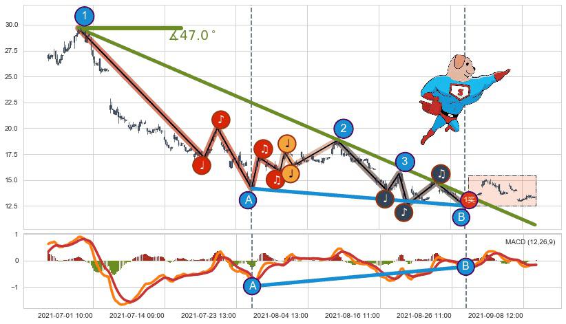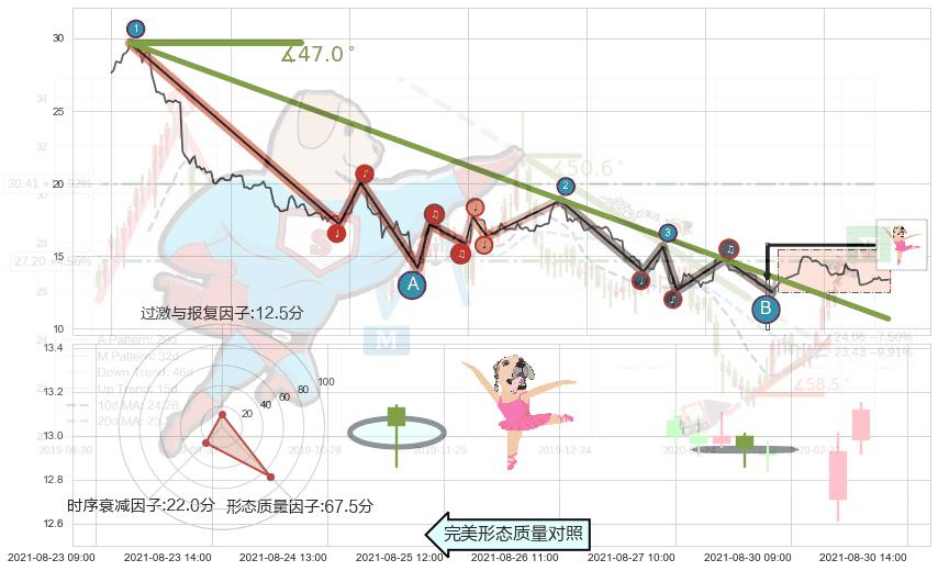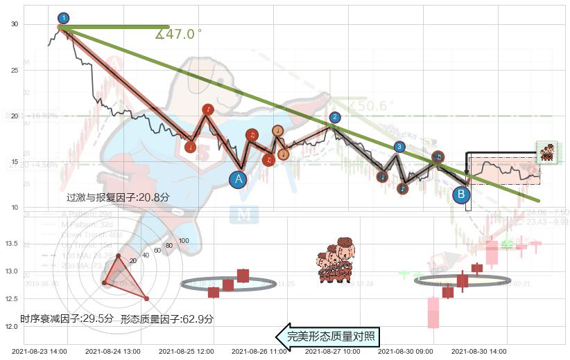 从2021-08-09 13:00至2021-08-31 13:00,共包含100个小时,阶段股价下跌-28.42%,阶段股价变动位移路程比: 1 : 5,下跌趋势角度: 48.5