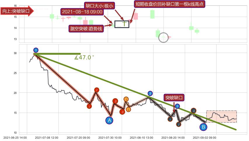 从2021-06-29 12:00至2021-08-31 13:00,共包含281个小时,阶段股价下跌-68.01%,阶段股价变动位移路程比: 1 : 6,下跌趋势角度: 47.0