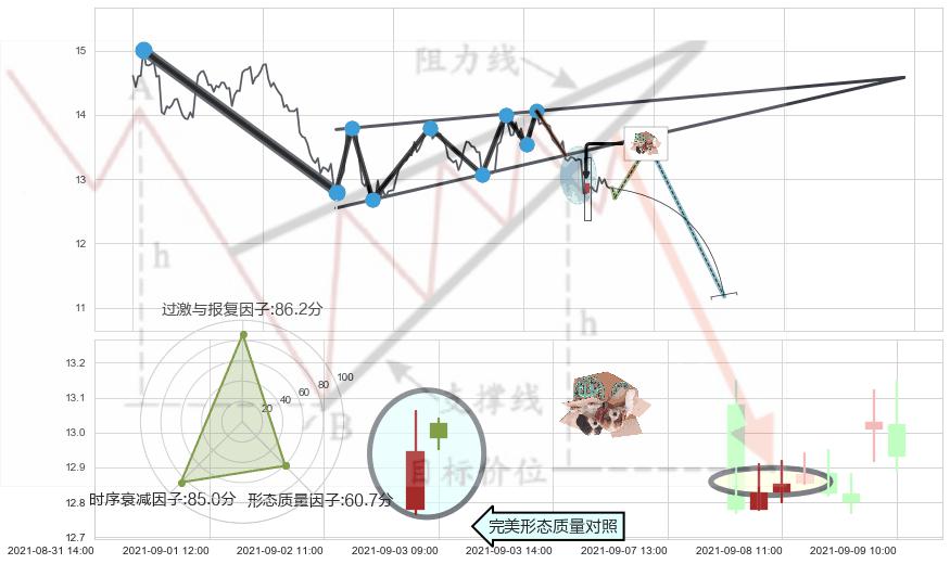 ➢ 🕰 价格走势在2021-09-08 10:00:00至2021-09-08 11:00:00期间形成顶部尽头线(下山虎),残存影响值:-5.89