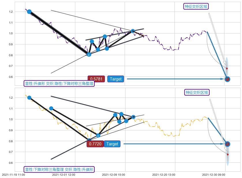 ➢ 下降对称三角整理:猜想预期下跌目标target即将达成,随后猜想强支撑来临,预期反弹上涨(均值回复)