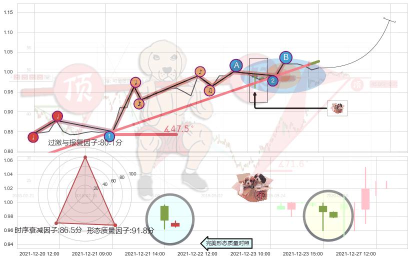 从2021-12-17 13:00至2021-12-27 15:00,共包含40个小时,阶段股价上涨18.09%,阶段股价变动位移路程比: 1 : 2,上涨趋势角度: 47.5