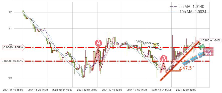 ♘ 支撑价格位0.9009,可信任强度76.44%,距离最后交易2021-12-27 16:00形成的收盘价格1.0100相差 -10.80%