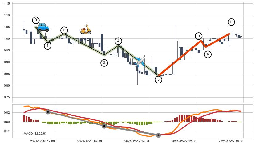 ➣ 波浪理论:猜想达到c点后小反弹终止反转下跌 → 下跌 → 【拐点】临近 → 阶段均值回复结束后继续大周期趋势跟踪
